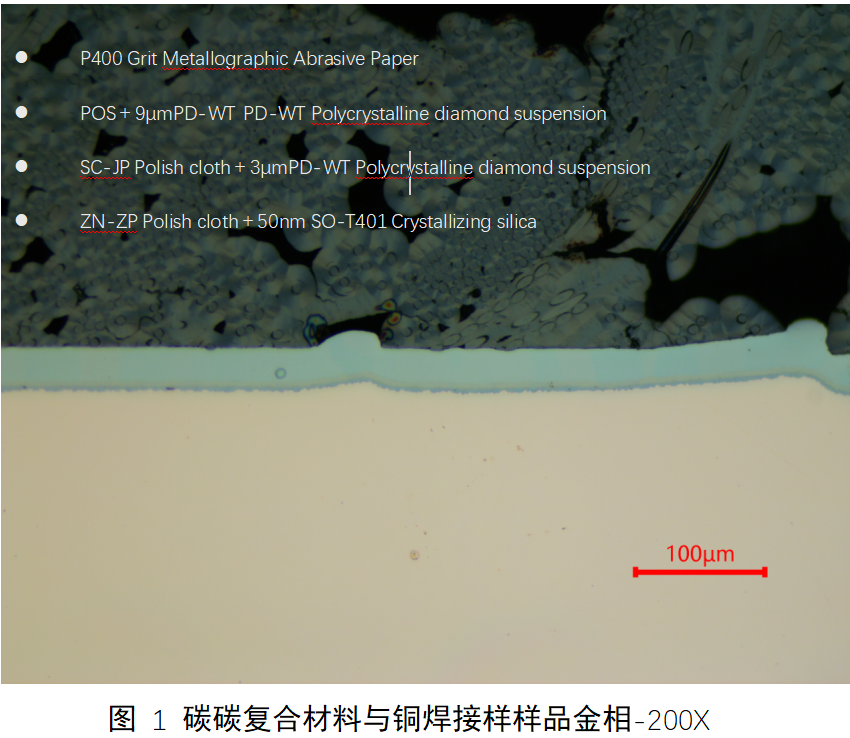 Amid the flames of spacecraft re-entering the atmosphere and in the circuit heart of new energy vehicles, the "tough guy and wise man" duo of carbon-carbon composite materials and copper welded joints are writing a material legend. As metallographic engineers, how do we decipher its microscopic codes? Next, we will take you on a journey to overcome the difficulties in preparing materials with different hardness and toughness in carbon-carbon composite material samples! For carbon-carbon composite materials and copper welding samples, to ensure the flatness of the prepared welding interface, it is recommended to use the POS plate four-step method for preparation. The following is the sample preparation process.